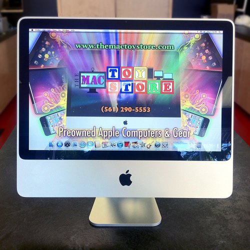 The all-in-one iMac packs a complete, high-performance computer including the latest Intel Core 2 Duo processors into a beautifully thin, anodized aluminum and glass design. The latest Intel Core 2 Duo processor runs at 2.4GHz with advanced 45-nm process technology and 6MB of shared L2 cache, allowing you to run your applications faster and more efficiently than ever before. This iMac features a glossy 20-inch widescreen display and ATI Radeon HD graphics, that gives you a blow-you-away level of detail and realism in games, three-dimensional graphics, high-resolution photos, and high-definition video that comes alive with rich, vivid color. Built into the top of iMac is an iSight camera. You'll hardly notice it's there until you want to launch iChat, Photo Booth, or iMovie. The remarkable picture quality and color accuracy make this tiny feature huge. With iLife '09, Mac OS X Leopard, built-in wireless, speakers, and ultrathin anodized aluminum Apple Wireless Keyboard, you'll be creating, sharing, surfing, and playing within minutes of opening the box. 20 Glossy Widescreen TFT Active-Matrix (1680 x 1050, 290 cd/m2, 800 - 1 contrast ratio, 160 H/V viewing angle) Liquid Crystal Display Built-in iSight Camera with Microphone ATI Radeon HD 2400 XT with 128MB GDDR3 Dedicated Video Memory Slot-loading 8x SuperDrive with 4x Double-Layer burning (DVD+-RW/CD-RW) Stereo speakers with 24-watt Digital Amplifier AirPort Extreme (802.11a/b/g/n) Bluetooth 2.1 + EDR 10/100/1000BASE-T (Gigabit) Ports - 3 x USB 2.0, FireWire 800, FireWire 400, Optical Digital Audio Output/Headphone out, Optical Digital Audio input/audio line in, mini-DVI with support for DVI, VGA, S-Video, and Composite Video connections via Optional Adapter, RJ-45 (LAN) Approximate Unit Dimensions - 18.5 (H) x 19.1 (W) x 7.4 (D) Approximate Unit Weight - 20 Pounds
